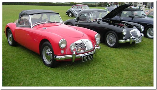 Here's the beautifully presented MG TD on the left that won the overall concours prize, with some modern thing next to it ( I'm told it's an MGF). And down to the right there is a superb 1958 MGA Twin Cam -- a rare and special beast that still gets around the country -- that won the 'Show and Shine' prize. My own Midget is there behind it on the right . And at the top there are two more beautifully presented MGAs, with an MGRV8 next door, and a Magnette saloon behind.