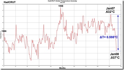 7390_large_hadcrut It took a century for earth's recorded average temperature to rise by 0.6 degrees Celsius, and then one year - last year -- for it to drop by between 0.6 and 0.75 degrees Celsius, depending on which of the four major global tracking agencies you follow  (that's Britain's Hadley Centre's graph for the last twenty years at right).