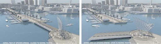 Pictured here are two of the seven final contestants in the competition for the planned 'Te Wero Bridge' in Auckland's viaduct.  Council has drawings of all seven finalists [hat tip Aaron Bhatnagar's Auckland Blog].  These are my own favourites: Entries Two (above) and Three: