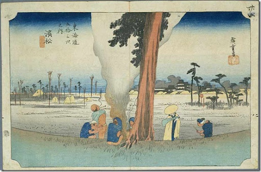 In this print he depicts our travellers in Hamamatsu. Hamamatsu's most famous attribute was its castle, and any contemporary viewer of this work would expect to see it featured prominently; the castle is shown, but hardly in the foreground: the foreground instead shows our travellers warming themselves by a bonfire in the shelter of a large tree, and through several unusual compositional devices -- some of which, such as cutting the page in half with a tree trunk and leaving empty space at the corners, violate all the canons of traditional western art -- our eye is led out from the travellers to the background in which the castle is seen. The lower sheltering bank unifies the composition, and its curve comes out to embrace the scene and the travellers.