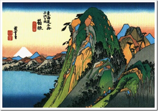 This is station eleven, looking down on Lake Ashi at Hakone. The climb here was considered one of the journey's most strenuous -- travellers can be seen making their way up the pass at bottom right -- but the reward was with this glorious view and the promise of the seven hot springs of Hakone. The easy simplicity of Hiroshige's style can be seen, and the compositional principle of 'balanced asymmetry' common to many Japanese wood block artists.