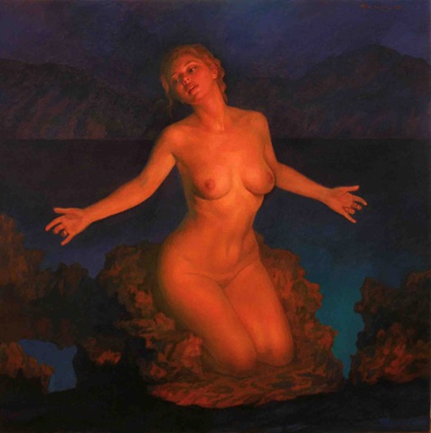 Newberry's Roman goddess of love and sexual healing has that white heat quality of the masters, and his subject. Often depicted in art, he captures his Venus arising at the break of dawn. Luminous, wide-eyed, almost holographic in three-dimensional intensity as he looks to come alluringly out of the canvas at the new world she's born into.