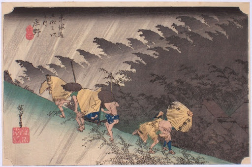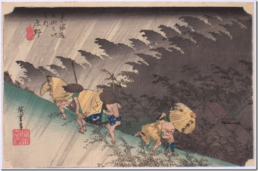Another of Hiroshige's wood block prints from the Tokaido series, this is one of his most well known: station forty-six, 'Shono – Sudden Rain,' published c. 1831-4. In this depiction, our travellers are caught in a downpour near the town of Shono in Ise Province. Says author Tomikichiro Tokuriki,