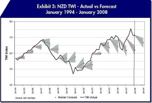 The phrase "friggin' hopeless" might occur to you about now. If it did, then think of something stronger because here's what that same "top ten consensus" made of exchange rates, as measured by the Trade Weighted Index (i.e. the weighted value of the NZD against the USD, AUD, Euro, Yen and GBP):