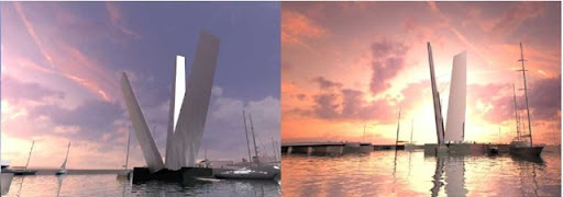 Pictured here are two of the seven final contestants in the competition for the planned 'Te Wero Bridge' in Auckland's viaduct.  Council has drawings of all seven finalists [hat tip Aaron Bhatnagar's Auckland Blog].  These are my own favourites: Entries Two (above) and Three: