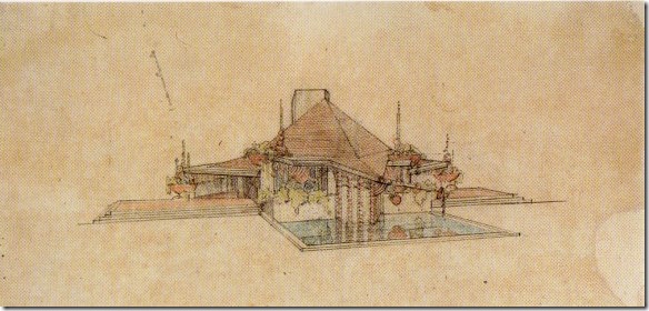 Despite the ‘Montessorian’ floor plan, the coloured globes and the reflecting pool of the perspective show more of the influence that Froebel had on Wright.